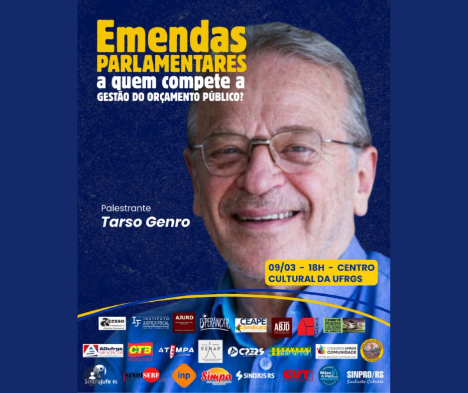 No dia 9 de março, no Centro Cultural da UFRGS, vamos debater o papel das emendas parlamentares na gestão do orçamento público. O encontro contará com Tarso Genro, ex-governador do RS e ex-ministro da Justiça e da Educação; Luiz Bolzan de Moraes, jurista e referência em
