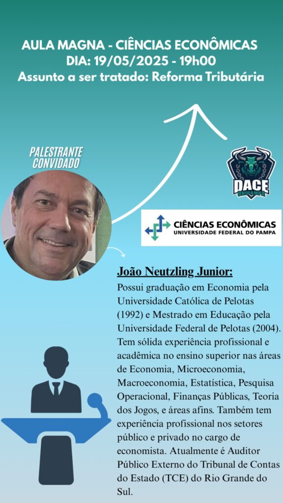 O Auditor de Controle Externo, João Neutzling é o convidado para a Aula Magna da Faculdade de Ciências Econômicas, a convite do Diretório Acadêmico de Ciências Econômicas (DACE), da Unipampa – Campus Santana do Livramento