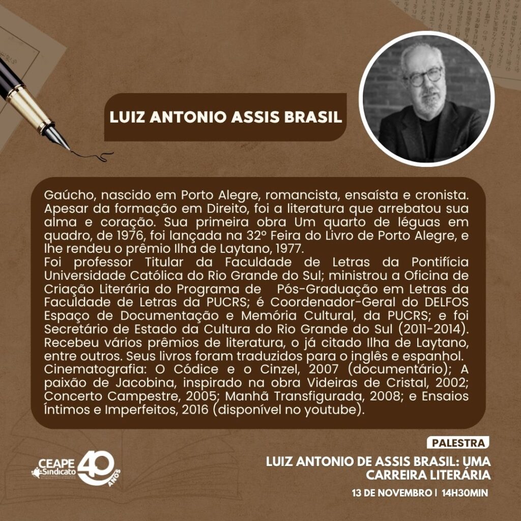 A carreira do escritor gaúcho Luiz Antonio de Assis Brasil será o tema do encontro de encerramento do programa Encontros, Histórias e Transformações, realizado pelo CEAPE-Sindicato e voltado aos associados aposentados e aposentadas. Será no dia 13/11 (quinta-feira), às 14h30min. Não perca!